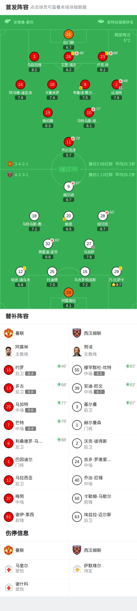 第83分钟,鲍恩头球被马兹拉维门线解围,马加萨补射扳平!曼联1-1西汉姆联